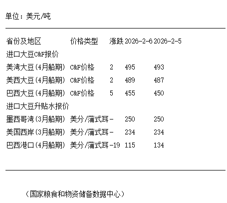 2月6日進(jìn)口大豆到國內(nèi)港口C&F及升貼水報價